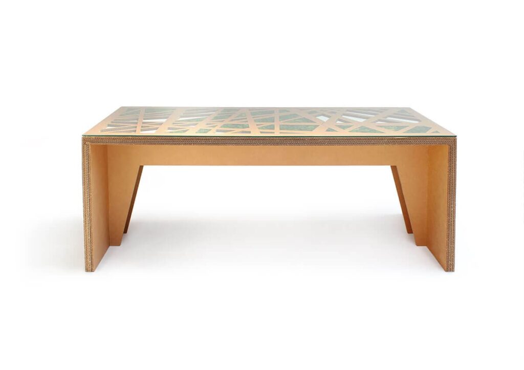 Le plateau en verre trempé sublime l’ensemble en ajoutant une note de transparence et de sophistication, tout en garantissant robustesse et résistance à l’abrasion. Pour une alternative encore plus responsable, WEISSHORN peut également être conçu en carton avec une finition blanche, s’adaptant ainsi à différentes préférences esthétiques et environnementales.
